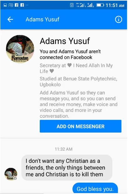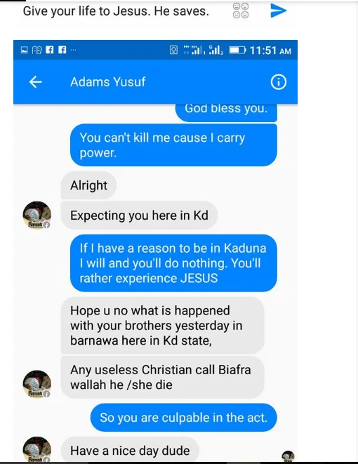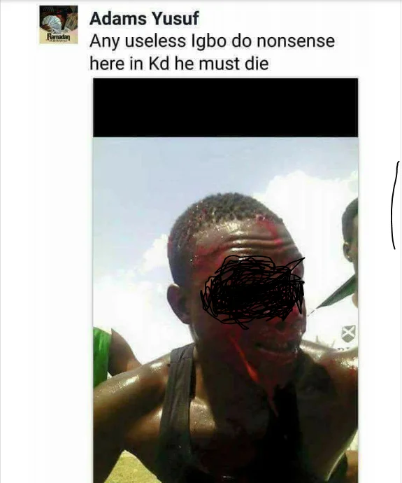 A Kaduna State-based Nigerian Muslim man, Adams Yusuf threatened to kill any Biafran Christian that visits the state. A Facebook user, To...