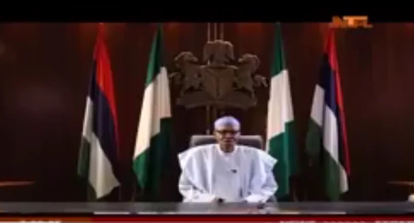 In 2016 Democracy day broadcast, President Buhari delivered the speech behind four flags; 2 National flags, and 2 Flags of Nigeria's Armed Forces – that symbolises the Commander in Chief of the Armed Forces.