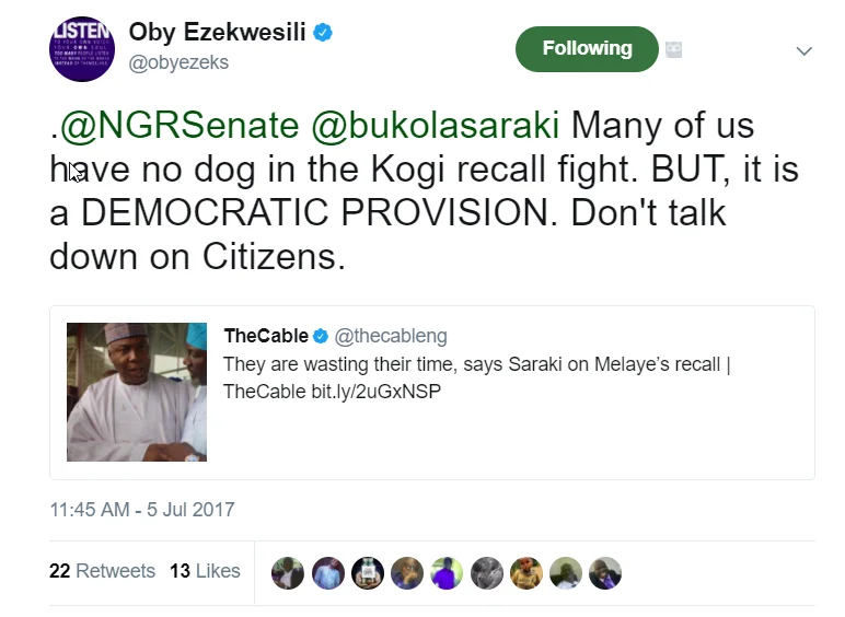 Former minister of Education, Oby Ezekwesili, took to twitter to admonish senate president, Bukola Saraki over statements he made about the senator Melaye's recall saga.