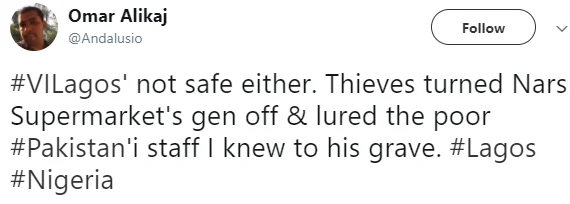 A Pakistani has been reportedly killed in an armed robbery incident which took place at Nas Supermarket, Victoria Island, Lagos. A twitt...