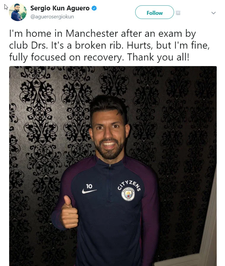 Sergio Aguero's message to fans after accident: I'm home in Manchester after an exam by club Drs. It's a broken rib. Hurts, b...