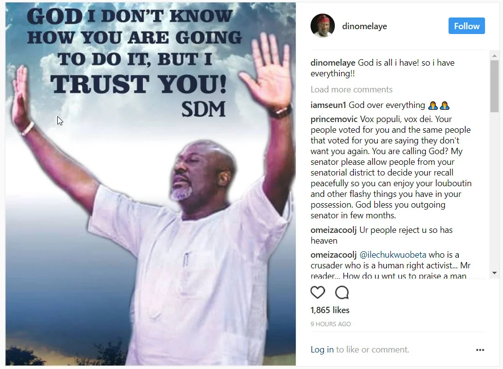 Senator Dino Melaye has turned to God to solve his political troubles. He posted a message on his Instagram account putting his trust in G...