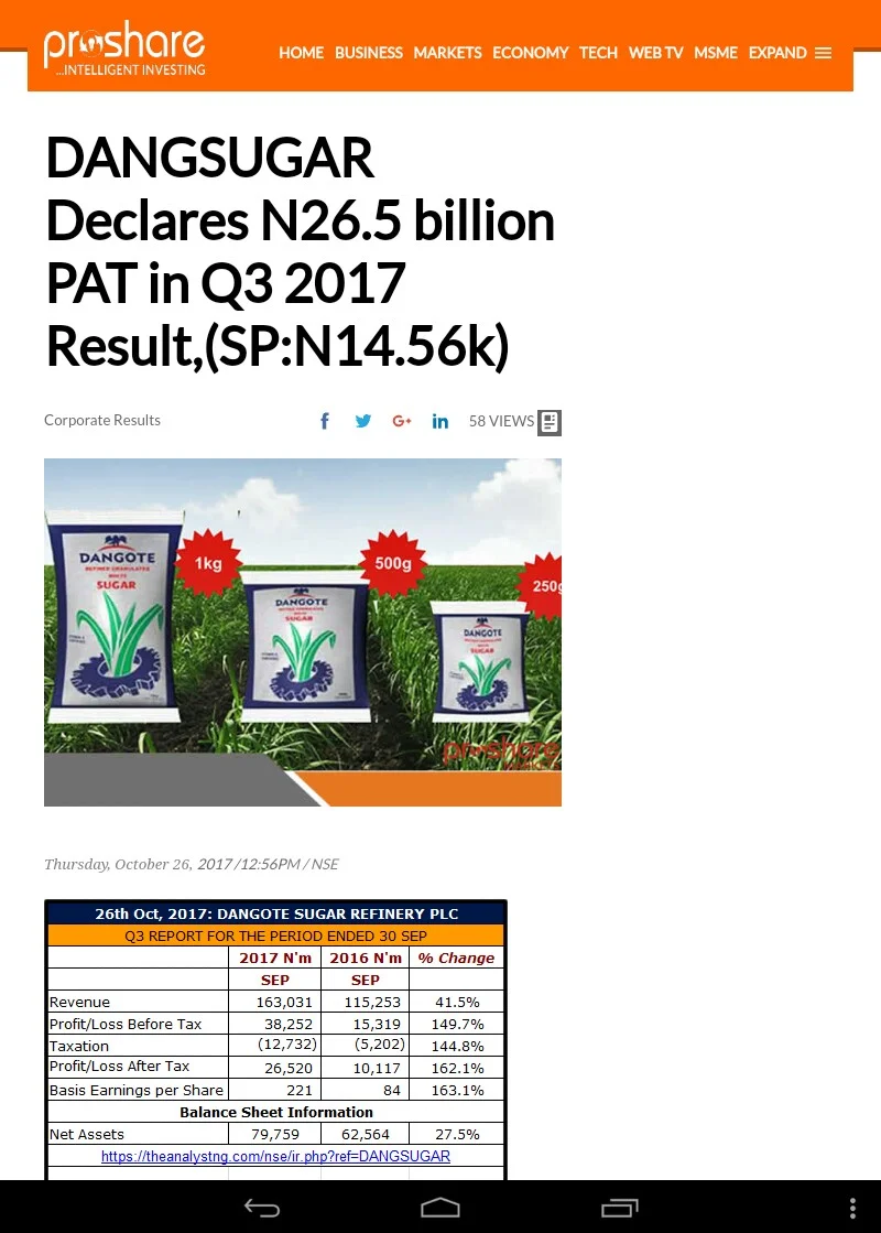 Dangote Sugar, an American of the Dangote Group has declared a profit after tax of N26.5bn in third quarter 2017, according to reports ...