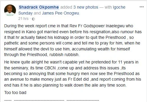 According to Facebook user, Shadrack Okpomhe, he claimed that the priest had framed his own kidnap and eventually left priesthood so as to have a normal life.